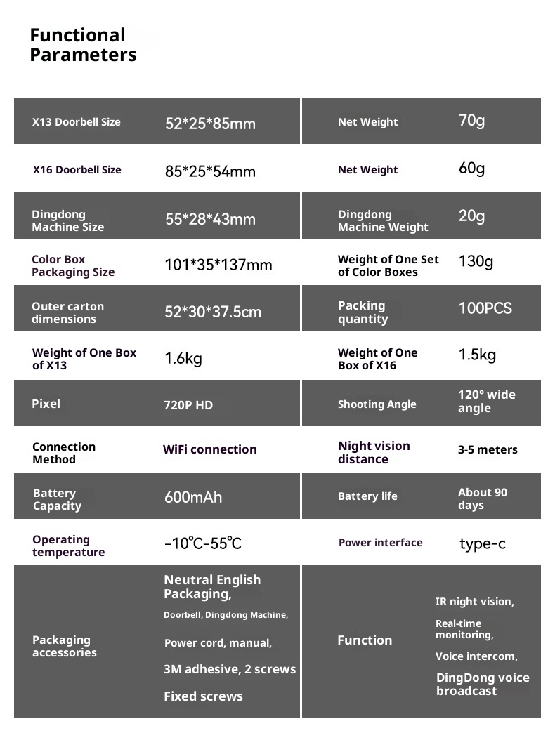 X13 doorbell + speaker + packaging box + charging cable + expansion screws + 3M fixing glue + instructions