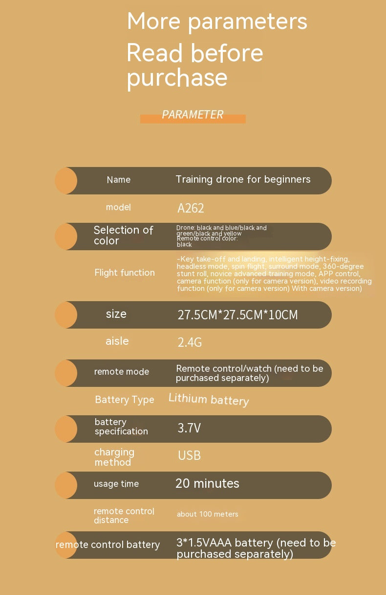Function description: Without camera: forward, backward, left turn, right turn, left wing, right wing, one click takeoff and landing, fixed altitude, headless mode, spin flight, surround mode, 360 degree stunt roll, beginner advanced training mode